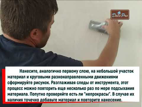 1 способ: Подготовленное основание равномерно закройте первым слоем материала шпателем или кельмой. Через несколько минут пригладьте поверхность чистым шпателем круговыми или разнонаправленными движениями, создавая желаемый рисунок. После высыхания материала, аналогичным образом закрывают вторым слоем.